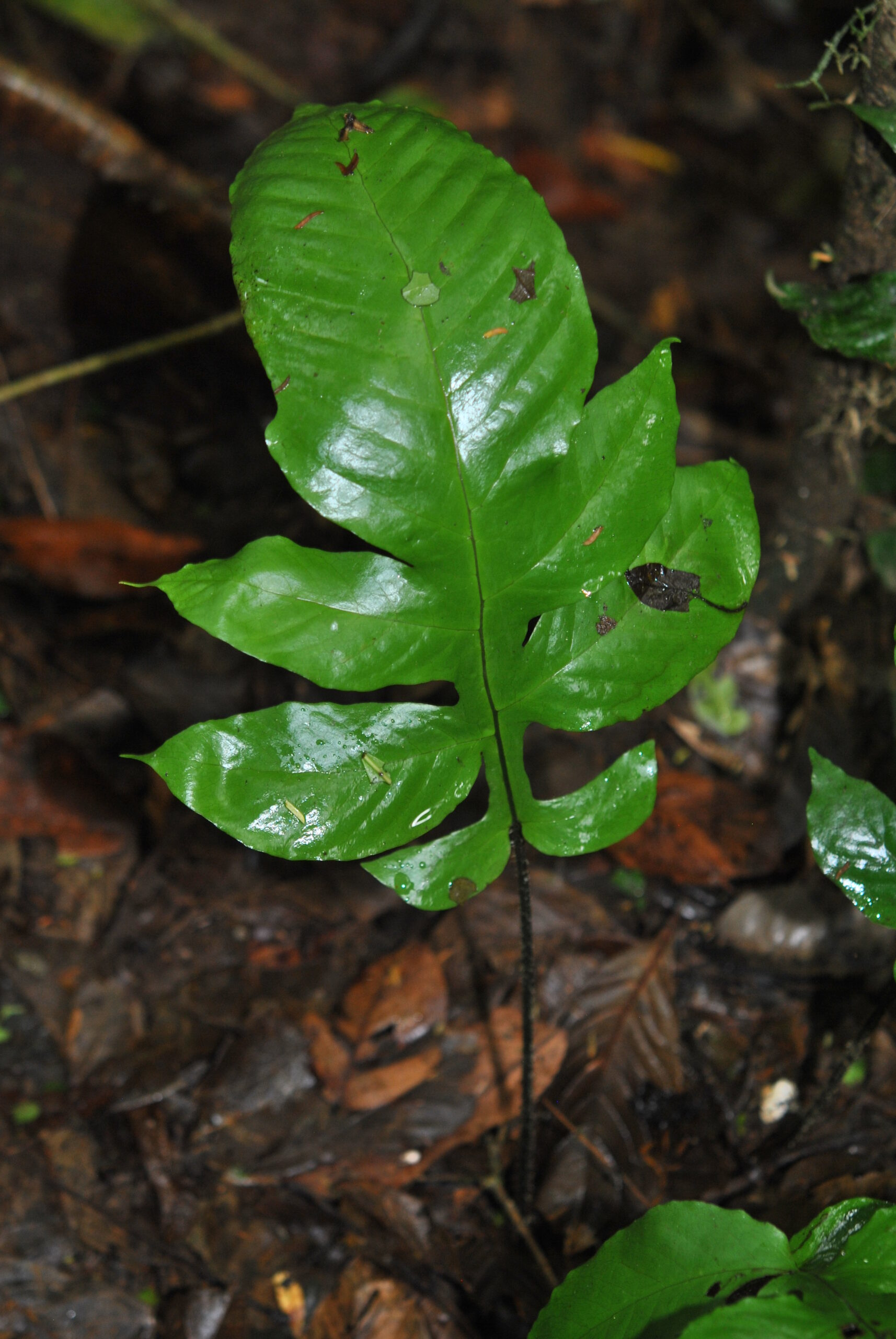 Hypoderris has been recently revised and now comprises three species. These are sister to to Triplophyllum and the two genera together are sister to Tectaria. Previously, Hypoderris nicotianifolia had long resided under Tectaria. The transfer of it into Hypoderris was made by Moran et al. following results of their recent phylogenetic study clarifying relationships in these groups. They point out that creeping rhizomes are shared by Hypoderris and Triplophyllum, whereas all Tectaria have erect rhizomes. Spiny perispores that lack broad folds and simple juvenile leaves with cordate bases further diagnose Hypoderris. In H. brownii, the type species, the indusium is attached below the sporangia, giving rise to the name of the genus. But in the other species the indusium is attached at the side similar to most Tectariaceae. For further details, see